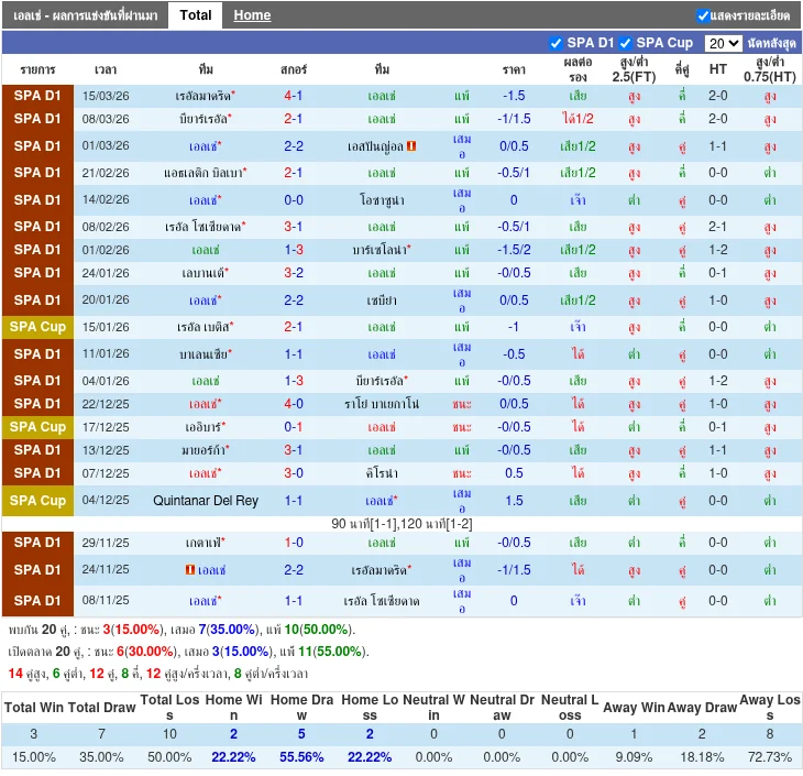 - 2026-03-01 | ลา ลีกา | เอลเช่ vs เอสปันญ่อล | 2 - 2 | เสมอ