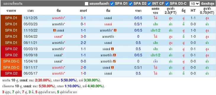การพบกัน 5 นัดหลัง: เอลเช่ชนะ 2 นัด มายอร์ก้าชนะ 1 นัด เสมอ 2 นัด สกอร์รวม เอลเช่ 8-6 เหนือกว่าจำนวนประตูรวม แต่ผลการพบกันออกได้ทั้งสองฝั่ง ไม่มีคู่แข่งที่ครองความได้เปรียบอย่างเด็ดขาด