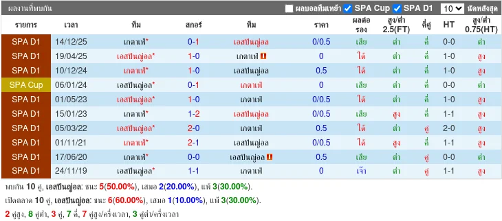 5 ครั้งหลังที่เจอกันค่อนข้างสูสี เอสปันญ่อลชนะ 3 เกม เกตาเฟ่ชนะ 2 เกม ส่วนใหญ่เป็นสกอร์ต่ำและเกมแน่น (หลายครั้งจบ 1-0) แสดงว่าเกมวันต่อวันมักตัดสินจากความแม่นยำโอกาสไม่มาก