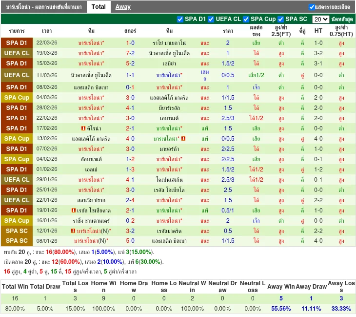 - 2026-03-07 | La Liga | แอธเลติก บิลเบา vs บาร์เซโลน่า | 0-1 | บาร์เซโลน่า ชนะ