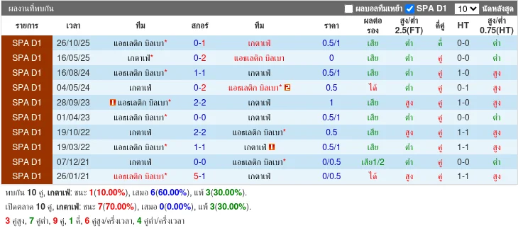 - 2025-10-25T16:30:00+00:00 | La Liga | Athletic Club vs Getafe | 0 - 1 | Getafe - 2025-05-15T19:30:00+00:00 | La Liga | Getafe vs Athletic Club | 0 - 2 | Athletic Club - 2024-08-15T17:00:00+00:00 | La Liga | Athletic Club vs Getafe | 1 - 1 | เสมอ - 2024-05-03T19:00:00+00:00 | La Liga | Getafe vs Athletic Club | 0 - 2 | Athletic Club - 2023-09-27T17:00:00+00:00 | La Liga | Athletic Club vs Getafe | 2 - 2 | เสมอ