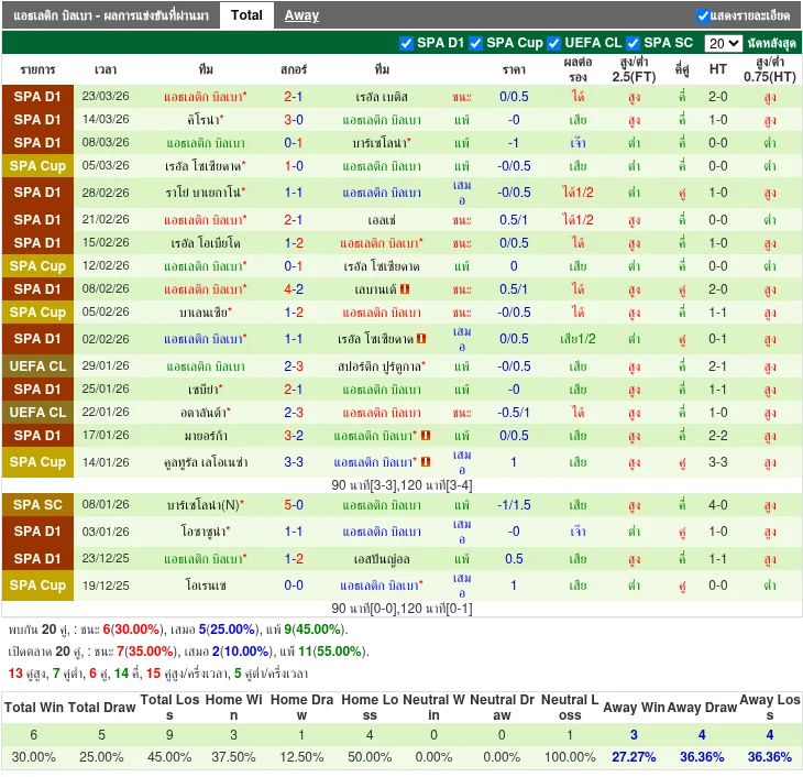 ฟอร์มทีมเยือน: แอธเลติก บิลเบา