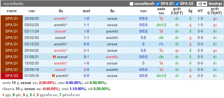 มาลอร์ก้า พบ อลาเวส 5 นัดล่าสุด ผลคือ มาลอร์ก้า ชนะ 1 เสมอ 3 แพ้ 1