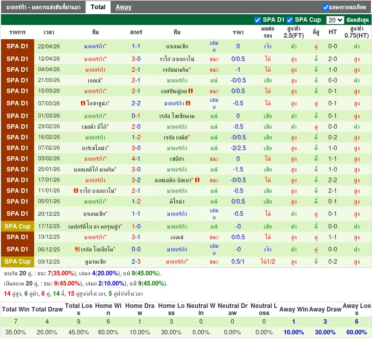 ฟอร์มเยือน 5 นัดหลังของทีมเยือน (มายอร์ก้า) ชนะ 3 เสมอ 1 แพ้ 1