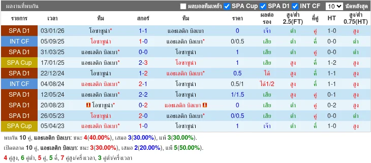 - 2026-01-03T15:15:00+00:00 | La Liga | Osasuna vs Athletic Club | 1-1 | เสมอ - 2025-03-30T16:30:00+00:00 | La Liga | Athletic Club vs Osasuna | 0-0 | เสมอ - 2025-01-16T18:30:00+00:00 | Copa del Rey | Athletic Club vs Osasuna | 2-3 | Osasuna - 2024-12-21T17:30:00+00:00 | La Liga | Osasuna vs Athletic Club | 1-2 | Athletic Club - 2024-08-03T18:30:00+00:00 | Friendlies Clubs | Athletic Club vs Osasuna | 2-1 | Athletic Club