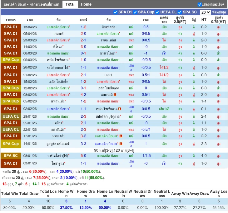 - 2026-04-12 | La Liga | Athletic Club vs Villarreal | 1 - 2 | Villarreal ชนะ - 2026-04-05 | La Liga | Getafe vs Athletic Club | 2 - 0 | Getafe ชนะ - 2026-03-22 | La Liga | Athletic Club vs Real Betis | 2 - 1 | Athletic Club ชนะ - 2026-03-14 | La Liga | Girona vs Athletic Club | 3 - 0 | Girona ชนะ - 2026-03-07 | La Liga | Athletic Club vs Barcelona | 0 - 1 | Barcelona ชนะ