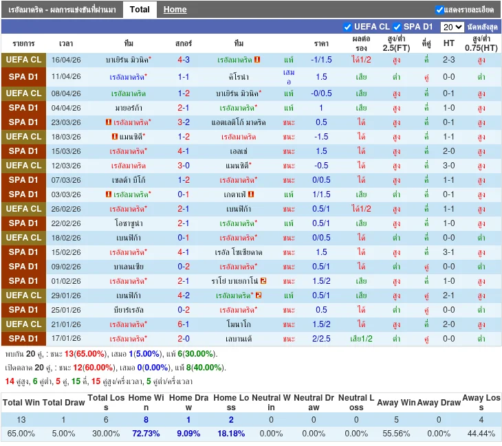 - 2026-04-07T19:00:00+00:00 | ยูฟ่า แชมเปี้ยนส์ ลีก | เรอัล มาดริด vs บาเยิร์น มิวนิค | 1 - 2 | ชนะ