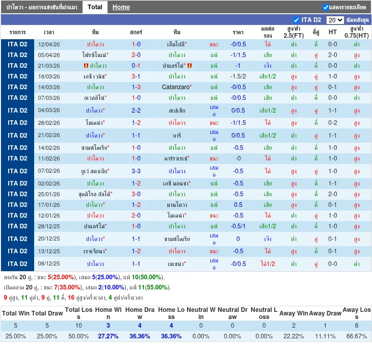- 2026-04-12T13:00:00+00:00 | Serie B | Padova vs Empoli | 1-0 | ชนะ - 2026-04-05T15:15:00+00:00 | Serie B | Frosinone vs Padova | 2-0 | แพ้ - 2026-03-21T14:00:00+00:00 | Serie B | Padova vs Palermo | 0-1 | แพ้ - 2026-03-17T19:00:00+00:00 | Serie B | Venezia vs Padova | 3-1 | แพ้ - 2026-03-14T14:00:00+00:00 | Serie B | Padova vs Catanzaro | 1-3 | แพ้