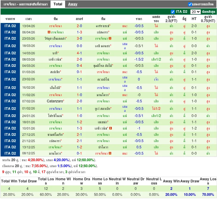 - 2026-04-12T17:30:00+00:00 | Serie B | Reggiana vs Carrarese | 2-0 | ชนะ - 2026-04-06T13:00:00+00:00 | Serie B | Reggiana vs Pescara | 1-3 | แพ้ - 2026-03-22T18:30:00+00:00 | Serie B | Virtus Entella vs Reggiana | 3-0 | แพ้ - 2026-03-17T19:00:00+00:00 | Serie B | Reggiana vs Monza | 0-0 | เสมอ - 2026-03-14T14:00:00+00:00 | Serie B | Bari vs Reggiana | 4-1 | แพ้