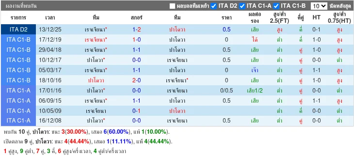 - 2025-12-13T14:00:00+00:00 | Serie B | Reggiana vs Padova | 1-2 | Padova - 2019-12-16T20:00:00+00:00 | Serie C - Girone B | Reggiana vs Padova | 1-0 | Reggiana - 2018-04-29T12:30:00+00:00 | Serie C | Reggiana vs Padova | 1-1 | เสมอ - 2017-12-09T19:30:00+00:00 | Serie C | Padova vs Reggiana | 0-0 | เสมอ - 2017-03-05T15:30:00+00:00 | Serie C | Reggiana vs Padova | 1-1 | เสมอ