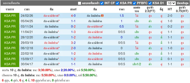 - 2026-02-23 | Pro League | Al-Qadisiyah FC vs Al-Ettifaq | 4-0 | Al-Qadisiyah FC ชนะn2025-04-05 | Pro League | Al-Qadisiyah FC vs Al-Ettifaq | 1-1 | เสมอn2024-11-02 | Pro League | Al-Ettifaq vs Al-Qadisiyah FC | 0-2 | Al-Qadisiyah FC ชนะn2021-04-10 | Pro League | Al-Ettifaq vs Al-Qadisiyah FC | 1-3 | Al-Qadisiyah FC ชนะn2020-12-27 | Pro League | Al-Qadisiyah FC vs Al-Ettifaq | 1-2 | Al-Ettifaq