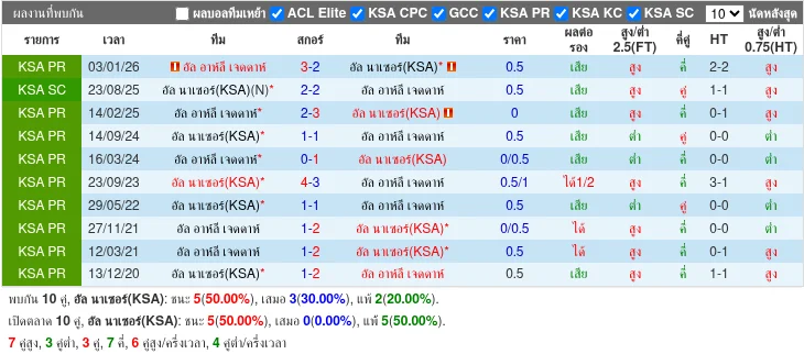- 2026-01-02T17:30:00+00:00 | Pro League | อัล-อาห์ลี เจดดาห์ vs อัล-นาสร์ | 3-2 | ชนะ-เสมอ-แพ้ - 2025-02-13T17:30:00+00:00 | Pro League | อัล-อาห์ลี เจดดาห์ vs อัล-นาสร์ | 2-3 | ชนะ-เสมอ-แพ้ - 2024-09-13T18:00:00+00:00 | Pro League | อัล-นาสร์ vs อัล-อาห์ลี เจดดาห์ | 1-1 | ชนะ-เสมอ-แพ้ - 2024-03-15T19:00:00+00:00 | Pro League | อัล-อาห์ลี เจดดาห์ vs อัล-นาสร์ | 0-1 | ชนะ-เสมอ-แพ้ - 2023-09-22T18:00:00+00:00 | Pro League | อัล-นาสร์ vs อัล-อาห์ลี เจดดาห์ | 4-3 | ชนะ-เสมอ-แพ้