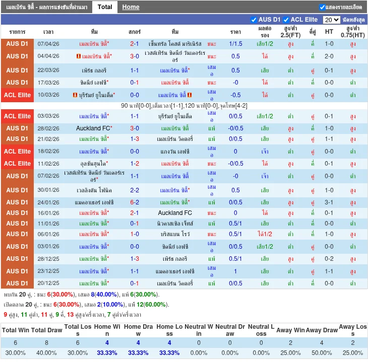 - 2026-03-22 | A-League | Perth Glory vs Melbourne City | 1 - 1 | เสมอ