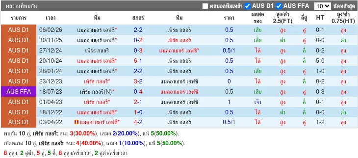Macarthur กับ Perth Glory พบกัน 5 นัดล่าสุด โดย Macarthur ชนะ 2, Perth Glory ชนะ 1, เสมอ 2