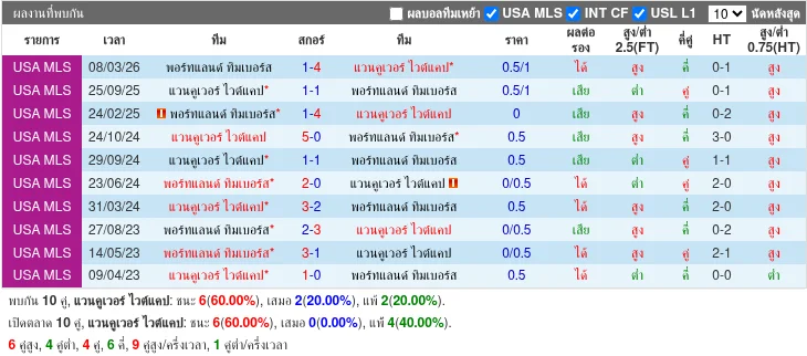 - 2026-03-08T03:30:00+00:00 | Major League Soccer | Portland Timbers vs Vancouver Whitecaps | 1 - 4 | Vancouver Whitecaps - 2025-09-25T02:30:00+00:00 | Major League Soccer | Vancouver Whitecaps vs Portland Timbers | 1 - 1 | เสมอ - 2025-02-23T21:00:00+00:00 | Major League Soccer | Portland Timbers vs Vancouver Whitecaps | 1 - 4 | Vancouver Whitecaps - 2024-10-24T02:30:00+00:00 | Major League Soccer | Vancouver Whitecaps vs Portland Timbers | 5 - 0 | Vancouver Whitecaps - 2024-09-29T02:30:00+00:00 | Major League Soccer | Vancouver Whitecaps vs Portland Timbers | 1 - 1 | เสมอ