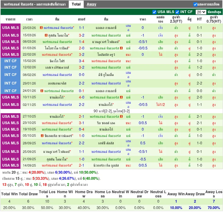 - 2026-03-22T20:45:00+00:00 | Major League Soccer | Portland Timbers vs Los Angeles Galaxy | 1 - 1 | เสมอ - 2026-03-15T00:30:00+00:00 | Major League Soccer | Houston Dynamo vs Portland Timbers | 3 - 2 | Houston Dynamo ชนะ - 2026-03-08T03:30:00+00:00 | Major League Soccer | Portland Timbers vs Vancouver Whitecaps | 1 - 4 | Vancouver Whitecaps ชนะ - 2026-02-28T21:30:00+00:00 | Major League Soccer | Colorado Rapids vs Portland Timbers | 2 - 0 | Colorado Rapids ชนะ - 2026-02-22T03:30:00+00:00 | Major League Soccer | Portland Timbers vs Columbus Crew | 3 - 2 | Portland Timbers ชนะ