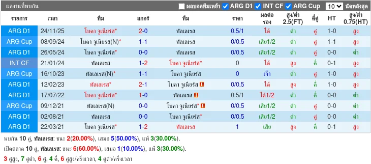 - 2026-04-02 | Liga Profesional Argentina | Talleres Cordoba vs Boca Juniors | 0 - 1 | Boca Juniors ชนะ - 2026-03-22 | Liga Profesional Argentina | Boca Juniors vs Instituto Cordoba | 2 - 0 | Boca Juniors ชนะ - 2026-03-16 | Liga Profesional Argentina | Union Santa Fe vs Boca Juniors | 1 - 1 | เสมอ - 2026-03-11 | Liga Profesional Argentina | Boca Juniors vs San Lorenzo | 1 - 1 | เสมอ - 2026-03-05 | Liga Profesional Argentina | Lanus vs Boca Juniors | 0 - 3 | Boca Juniors ชนะ