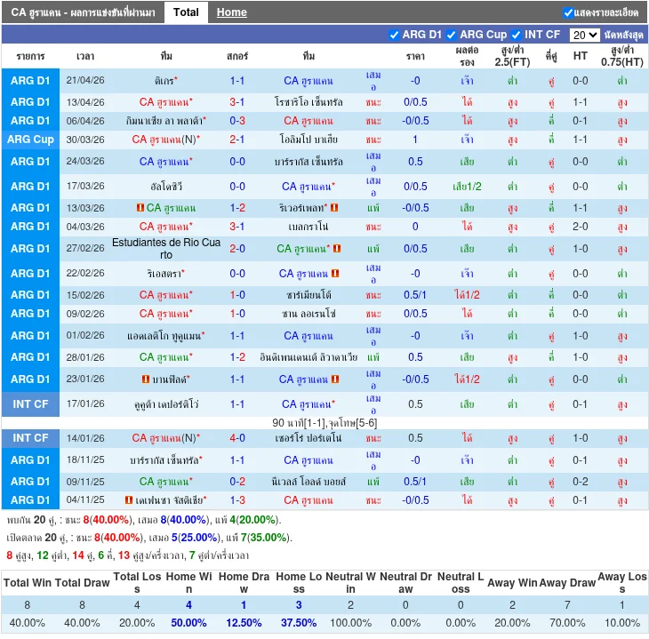 - 2026-04-05 18:30 | ลีกโปรเฟสชัน อาร์เจนตินา | กิมนาเซีย ลาปลาต้า vs ฮูราแคน | 0 - 3 | ฮูราแคน ชนะ