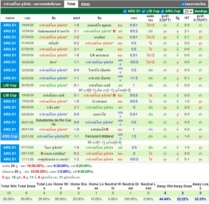 - 2026-03-27 00:00 | ลีกโปรเฟสชัน อาร์เจนตินา | อาร์เจนติโนส จูเนียร์ส vs ลานัส | 2 - 1 | อาร์เจนติโนส จูเนียร์ส ชนะ