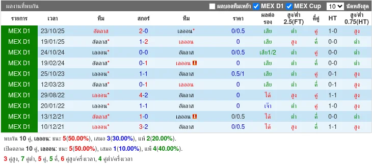 - 2025-10-23T03:00:00+00:00 | Liga MX | Atlas vs Leon | 2-0 | Atlas - 2025-01-19T03:00:00+00:00 | Liga MX | Atlas vs Leon | 1-2 | Leon - 2024-10-24T03:00:00+00:00 | Liga MX | Leon vs Atlas | 0-0 | เสมอ - 2024-02-18T22:00:00+00:00 | Liga MX | Atlas vs Leon | 0-1 | Leon - 2023-10-25T01:00:00+00:00 | Liga MX | Leon vs Atlas | 1-1 | เสมอ