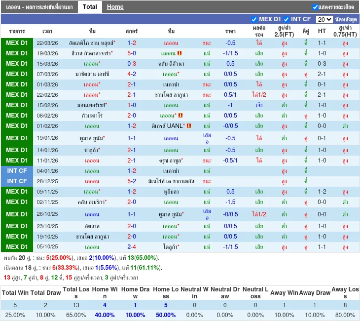 - 2026-03-22T01:00:00+00:00 | Liga MX | Atletico San Luis vs Leon | 1 - 2 | Leon - 2026-03-19T02:07:00+00:00 | Liga MX | Guadalajara Chivas vs Leon | 5 - 0 | Guadalajara Chivas ชนะ - 2026-03-15T01:00:00+00:00 | Liga MX | Leon vs Club Tijuana | 0 - 3 | Club Tijuana ชนะ - 2026-03-07T01:00:00+00:00 | Liga MX | Mazatlán vs Leon | 4 - 2 | Mazatlán ชนะ - 2026-03-01T01:06:00+00:00 | Liga MX | Leon vs Necaxa | 2 - 1 | Leon ชนะ