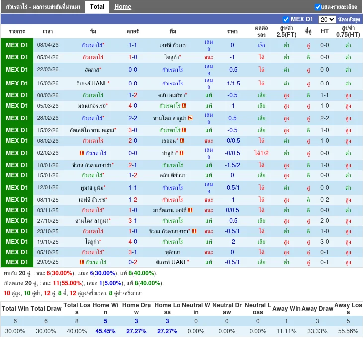 - 2026-04-08 | Liga MX | Club Queretaro vs FC Juarez | 1 - 1 | เสมอ - 2026-04-04 | Liga MX | Club Queretaro vs Toluca | 1 - 0 | Club Queretaro ชนะ - 2026-03-21 | Liga MX | Atlas vs Club Queretaro | 0 - 0 | เสมอ - 2026-03-15 | Liga MX | Tigres UANL vs Club Queretaro | 0 - 0 | เสมอ - 2026-03-07 | Liga MX | Club Queretaro vs Club America | 1 - 2 | Club America ชนะ