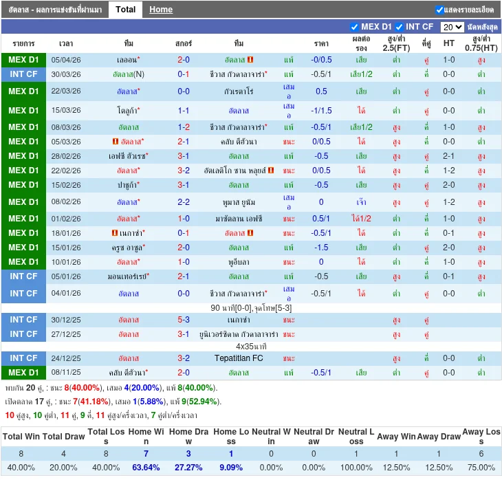 - 2026-03-08 | Liga MX | แอตลาส vs กวาดาลาฮารา ชิวาส | 1-2 | กวาดาลาฮารา ชิวาส ชนะ