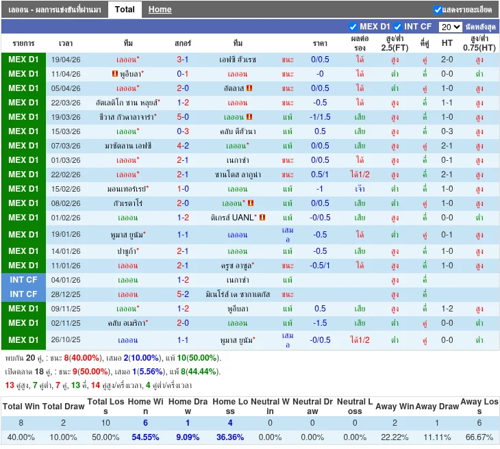 - 2026-04-19T03:06:00+00:00 | Liga MX | ลีออน vs เอฟซี ฮัวเรซ | 3-1 | ลีออน ชนะ