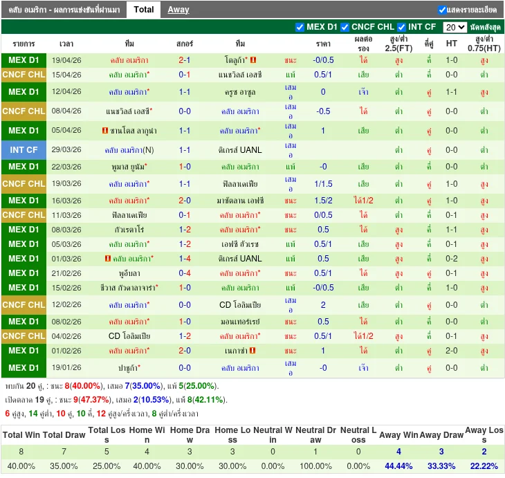 - 2025-02-20T01:00:00+00:00 | Liga MX | คลับ อเมริกา vs ลีออน | 1-1 | เสมอ