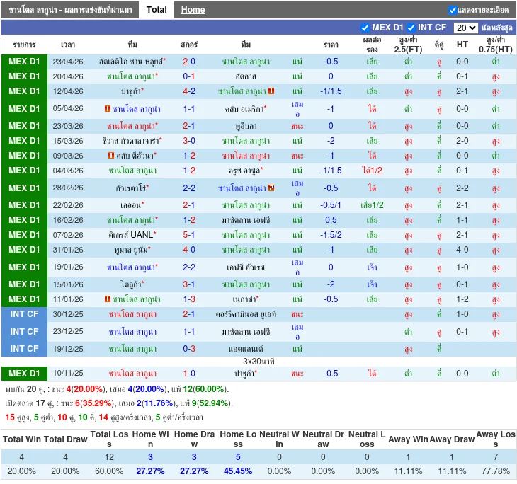 - 2026-04-23 | Liga MX | แอตเลติโก ซาน ลูอิส - ซานโตส ลากูน่า | 2 - 0 | ชนะ
