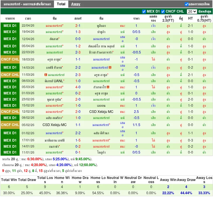 - 2026-04-22 | Liga MX | มอนเทร์เรย์ - พูเอบลา | 2 - 1 | แพ้