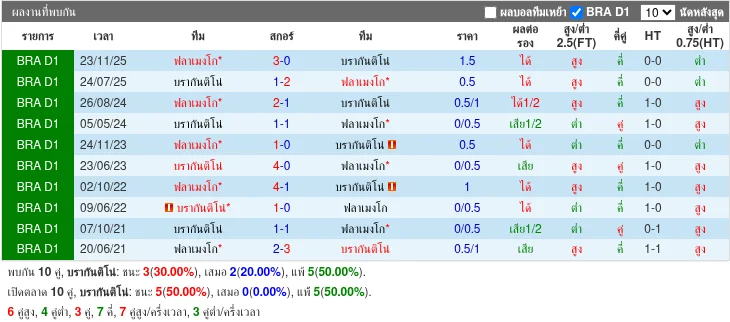 สถิติการพบกัน 5 นัดหลังระหว่าง RB Bragantino กับ Flamengo แฟลลาเมงโก้ทำได้ดีกว่าในรอบหลายปี โดยชนะ 3 จาก 5 นัดที่ผ่านมา แม้จะมีชัยชนะของ Bragantino ในบ้าน 3-0 ล่าสุด แต่ภาพรวม Flamengo มีฟอร์มดีและความสม่ำเสมอกว่า
