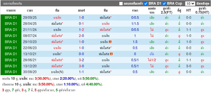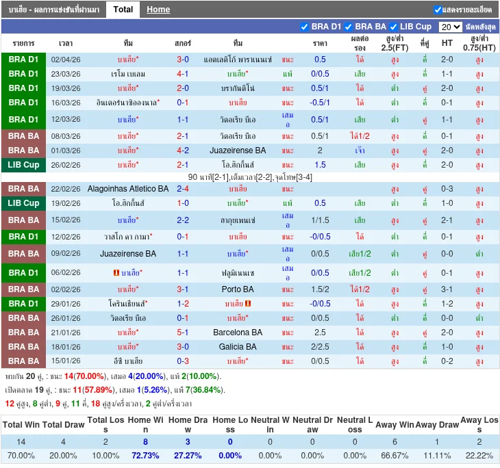 - 2026-04-01T23:00:00+00:00 | Serie A | Bahia vs Atletico Paranaense | 3 - 0 | Bahia ชนะ - 2026-03-22T19:00:00+00:00 | Serie A | Remo vs Bahia | 4 - 1 | Remo ชนะ - 2026-03-18T22:00:00+00:00 | Serie A | Bahia vs RB Bragantino | 2 - 0 | Bahia ชนะ - 2026-03-15T19:00:00+00:00 | Serie A | Internacional vs Bahia | 0 - 1 | Bahia ชนะ - 2026-03-11T23:00:00+00:00 | Serie A | Bahia vs Vitoria | 1 - 1 | เสมอ