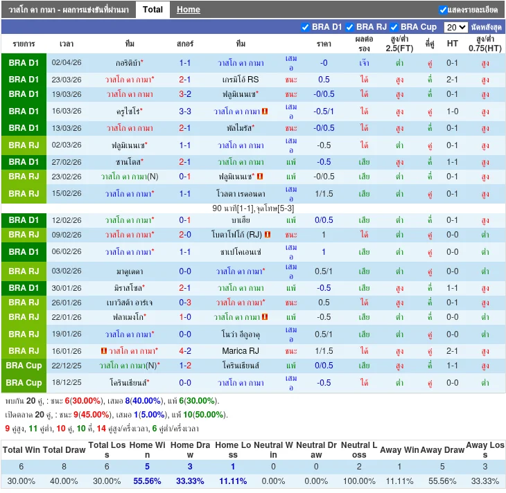 - 2026-04-01T23:30:00+00:00 | Serie A | โครติบา vs วาสโก้ ดา กามา | 1-1 | เสมอ - 2026-03-22T19:00:00+00:00 | Serie A | วาสโก้ ดา กามา vs เกรมิโอ | 2-1 | ชนะ - 2026-03-19T00:30:00+00:00 | Serie A | วาสโก้ ดา กามา vs ฟลูมินิเซ | 3-2 | ชนะ - 2026-03-15T23:30:00+00:00 | Serie A | ครูเซโร vs วาสโก้ ดา กามา | 3-3 | เสมอ - 2026-03-12T22:30:00+00:00 | Serie A | วาสโก้ ดา กามา vs ปัลเมรัส | 2-1 | ชนะ