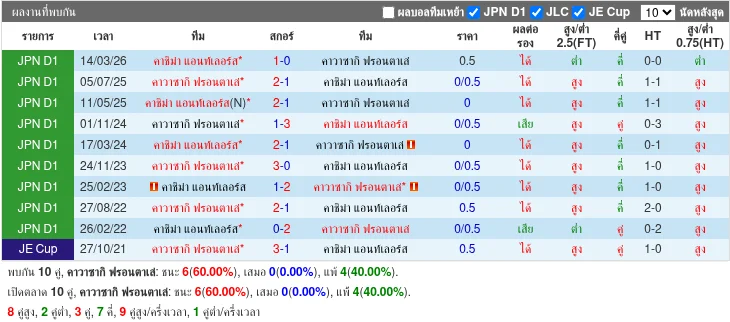 สถิติพบกัน 5 นัดล่าสุด คาชิมะ แอนท์เลอร์ส เอาชนะคู่แข่งไป 4 ครั้ง คาวาซากิ ฟรอนทาเล ชนะ 1 ครั้ง