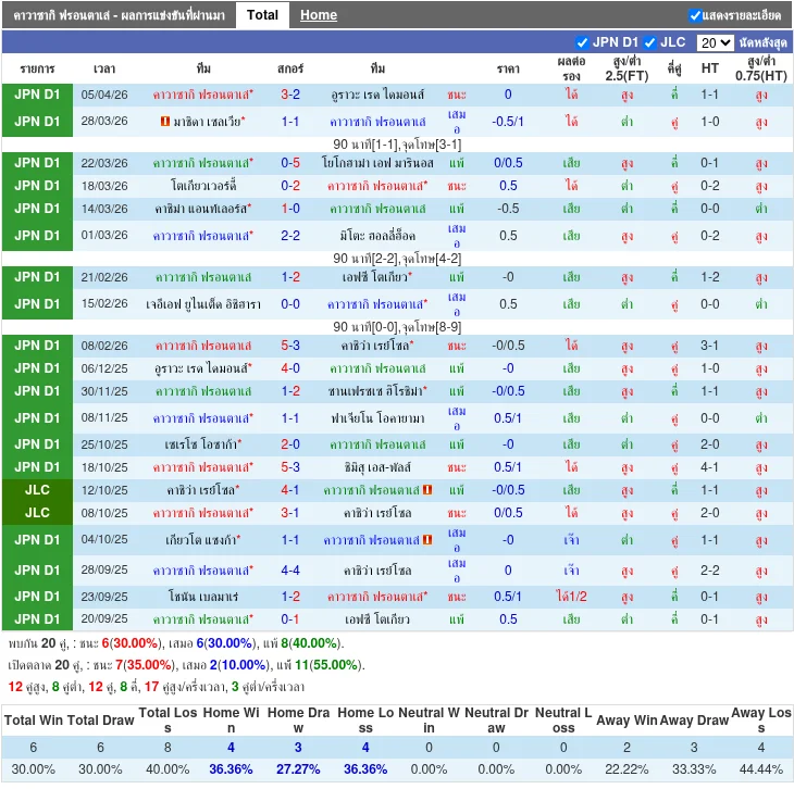 - 2026-04-05 | J1 League | คาวาซากิ ฟรอนทาเล vs อูราวะ | 3 - 2 | ชนะ