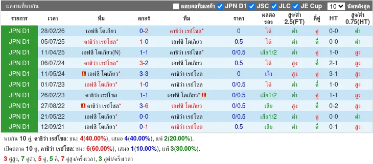 - (2026-02-28 | J1 League | FC Tokyo vs Kashiwa Reysol | 0 - 2 | ชนะ) - (2025-07-05 | J1 League | Kashiwa Reysol vs FC Tokyo | 1 - 0 | ชนะ) - (2025-04-11 | J1 League | FC Tokyo vs Kashiwa Reysol | 1 - 1 | เสมอ) - (2024-07-30 | Friendlies Clubs | FC Tokyo vs Kashiwa Reysol | 0 - 1 | ชนะ) - (2024-07-06 | J1 League | Kashiwa Reysol vs FC Tokyo | 3 - 2 | ชนะ)