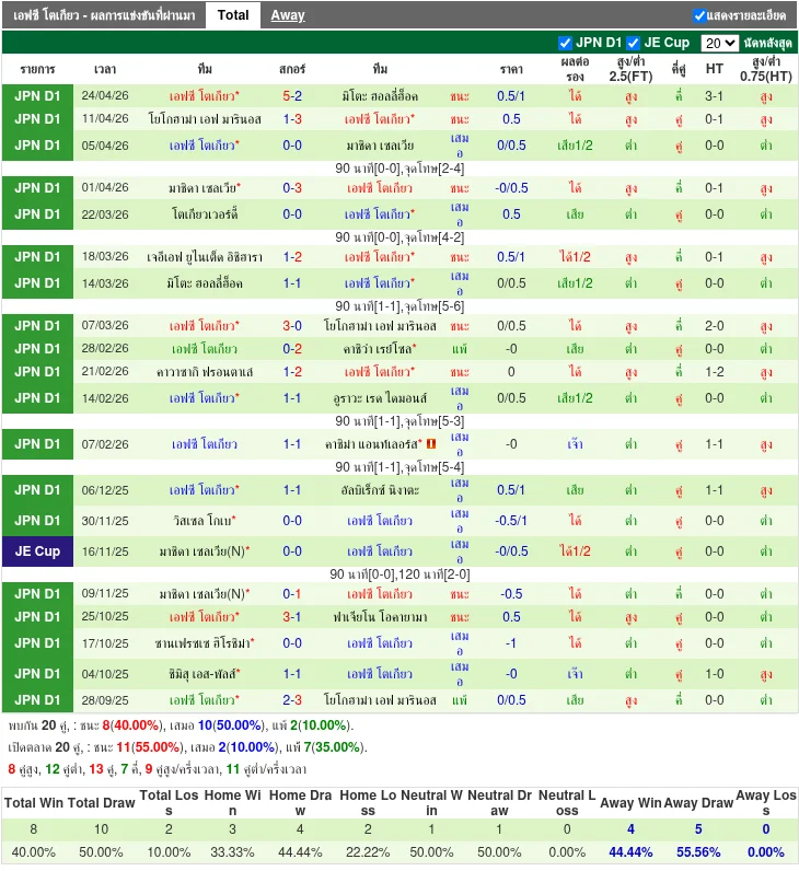- (2026-04-24 | J1 League | FC Tokyo vs Mito Hollyhock | 5 - 2 | แพ้) - (2026-04-11 | J1 League | Yokohama F. Marinos vs FC Tokyo | 1 - 3 | ชนะ) - (2026-04-01 | J1 League | Machida Zelvia vs FC Tokyo | 0 - 3 | ชนะ) - (2026-03-18 | J1 League | JEF United Chiba vs FC Tokyo | 1 - 2 | ชนะ) - (2026-03-07 | J1 League | FC Tokyo vs Yokohama F. Marinos | 3 - 0 | ชนะ)