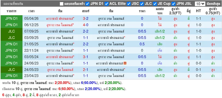 อุราวะ เรดเดมอนด์ส เห็นได้ชัดว่าผลงานในบ้านไม่สู้ดีนัก โดยห้าเกมที่ผ่านมากลายเป็นจุดอ่อนเรื่องเกมรับเสียประตูหลายครั้งและไม่ค่อยมีความดุดันในการบุก ขณะที่แนวรุกยังผลงานไม่สม่ำเสมอ โดยเฉพาะช่วงจบเกมที่หายไปหลายจุดสำคัญ ขณะที่คาวาซากิ ฟรอนตาเล่ แม้จะแสดงภาพลักษณ์เป็นทีมรุกเด่นในบางนัด แต่ก็มีหลุดพอสมควรในเกมเยือน มีบันทึกชนะ-แพ้สลับกันไป โดยนัดล่าสุดพวกเขาบุกมาถล่มเจ้าถิ่น 3-2 สร้างความมั่นใจให้ทีมในทิศทางบุกต่อ จุดเด่นของเจ้าถิ่นคือเกมรับที่ยังไม่เหนียวแน่น ส่วนทีมเยือนมีโอกาสเปิดเกมรุกได้หลายช่องทางจากปีกและความคล่องตัวของคู่หูแนวรุก เกมน่าจะสูสีกัน และมีโอกาสทำประตูมากกว่าในช่วง 20 นาทีสุดท้าย เกมนี้น่าจะเป็นการต่อสู้ที่วัดกันที่จังหวะและความแม่นยำในการเปลี่ยนและจุดเปลี่ยนเกม