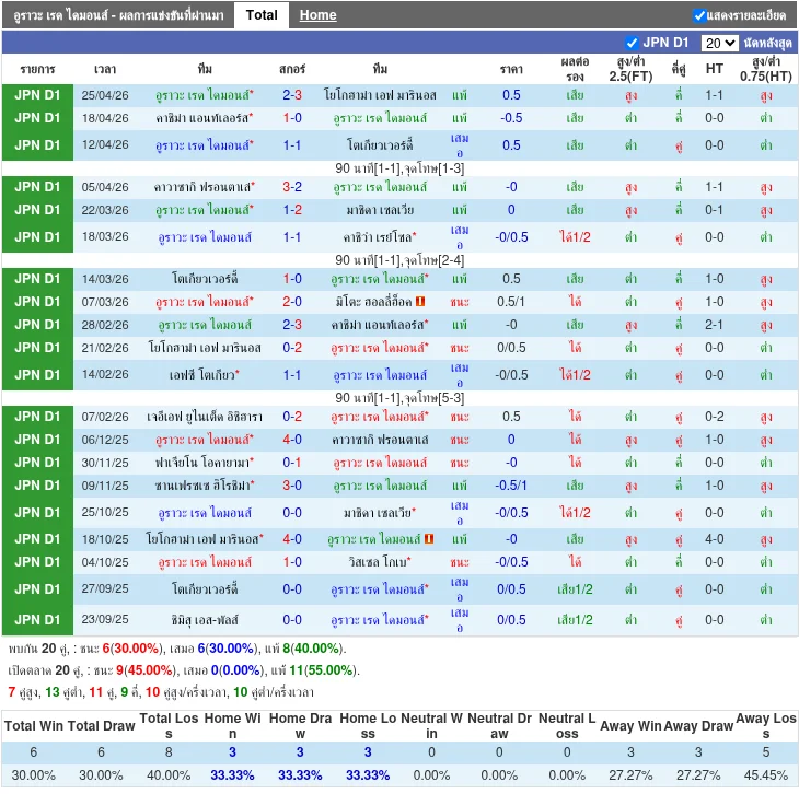 - 2026-04-25T05:00:00+00:00 | J1 League | อุราวะ เรดเดมอนด์ส vs โยโกฮาม่า เอฟ. มารินอส | 2-3 | แพ้