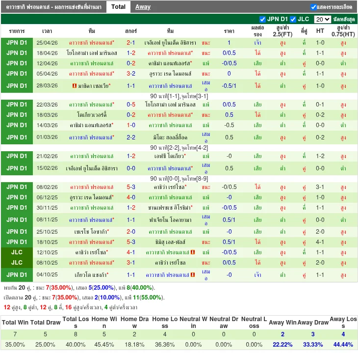 - 2026-04-25T06:00:00+00:00 | J1 League | คาวาซากิ ฟรอนตาเล่ vs เจเอฟ ยูไนเต็ด ชิบะ | 2-1 | ชนะ