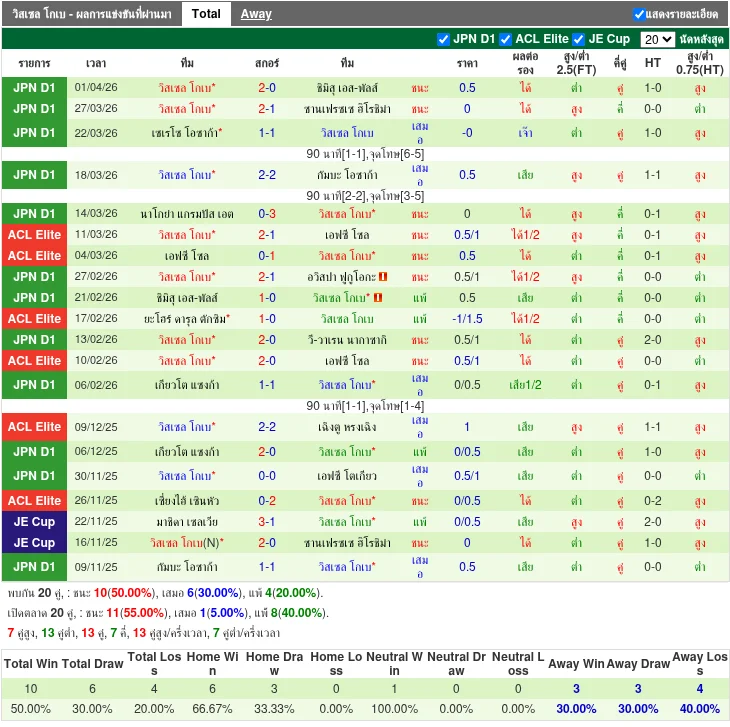 - 2026-04-01 | J1 League | วิสเซล โกเบ vs ชิมิสุ เอส-พัลส์ | 2 - 0 | ชนะ