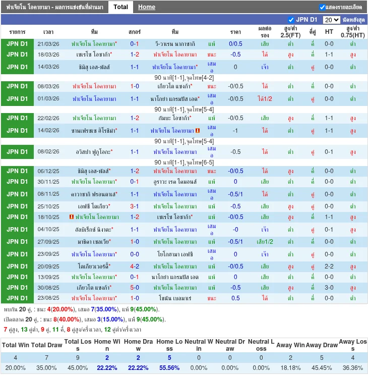 - 2026-03-08 | J1 League | ฟากิอาโน โอคายามะ vs เคียวโตะ ซังกา | 1 - 0 | ชนะ