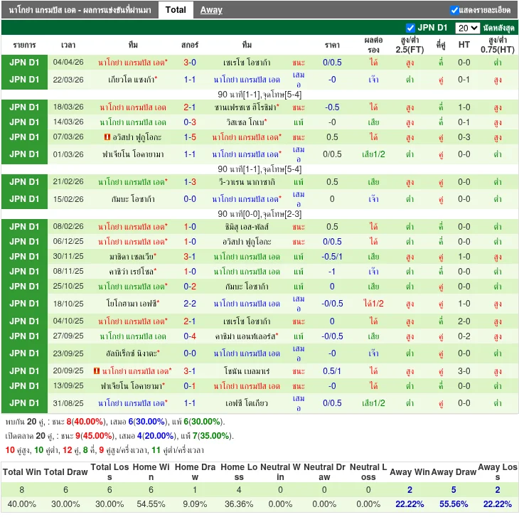 ฟอร์มทีมเยือน: นาโกย่า แกรมปัส เอต