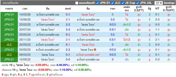 - 2026-04-04T06:00:00+00:00 | J1 League | Nagoya Grampus vs Cerezo Osaka | 3-0 | แพ้ - 2026-03-18T10:00:00+00:00 | J1 League | Nagoya Grampus vs Sanfrecce Hiroshima | 2-1 | แพ้ - 2026-03-14T05:00:00+00:00 | J1 League | Nagoya Grampus vs Vissel Kobe | 0-3 | ชนะ - 2026-03-07T07:00:00+00:00 | J1 League | Avispa Fukuoka vs Nagoya Grampus | 1-5 | ชนะ - 2026-02-21T06:00:00+00:00 | J1 League | Nagoya Grampus vs V-varen Nagasaki | 1-3 | ชนะ