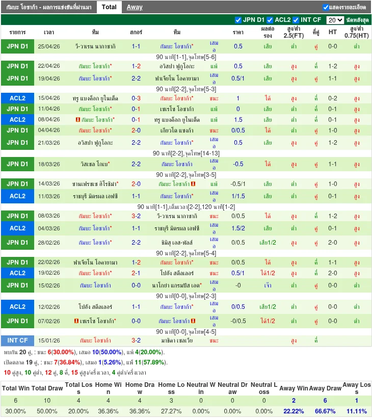 - 2026-04-11 | J1 League | Gamba Osaka vs Cerezo Osaka | 0-1 | Cerezo Osaka ชนะ