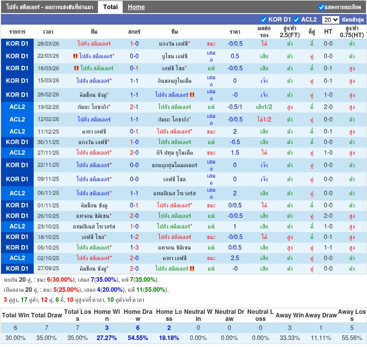 - 2026-03-28 | K League 1 | โพฮัง สตีลเลอร์ส vs กังวอน เอฟซี | 1-0 | ชนะ