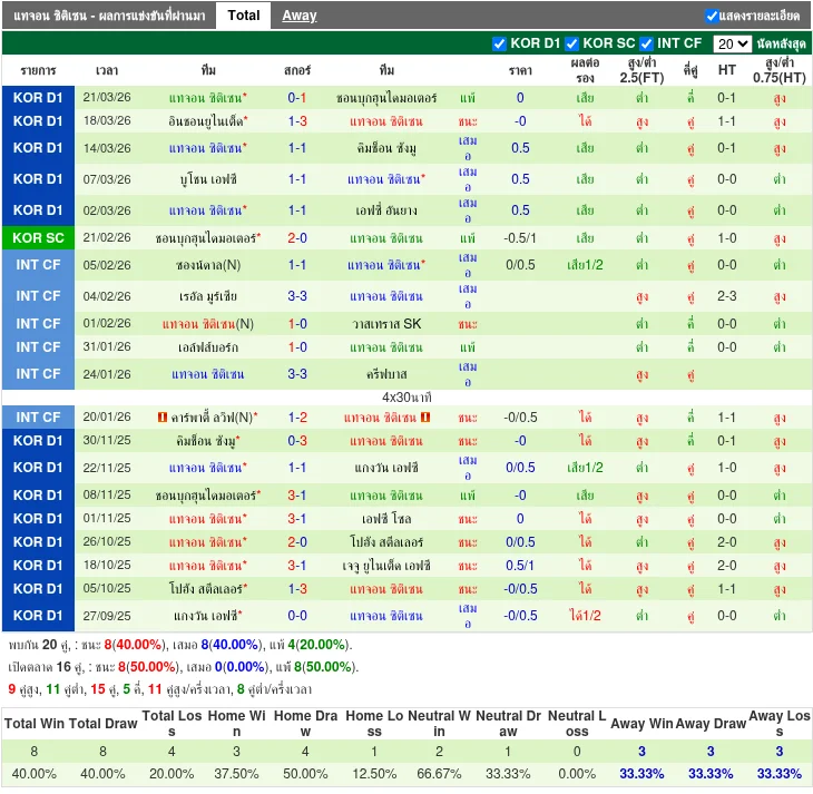 - 2026-03-14 | K League 1 | แดเจอน ซิตี้เซ็น vs กิมชอน ซังมู เอฟซี | 1-1 | เสมอ
